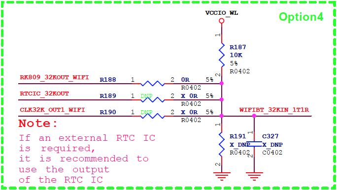 RK809提供,但是为了节省成本,没有贴相应的晶震,而转由HYM8563提供,但是对应的时钟通路并没有切换到HYM8563,因此需要下图中的R188电阻,上R189电阻
